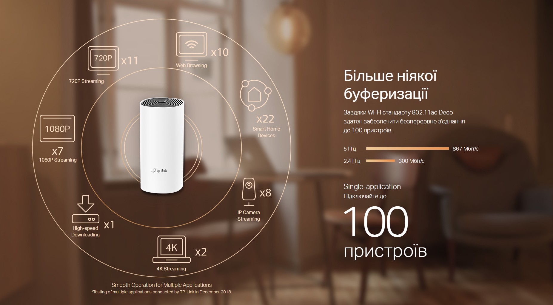 Завдяки Wi-Fi стандарту 802.11ac Deco здатен забезпечити безперервне з'єднання до 100 пристроїв.
