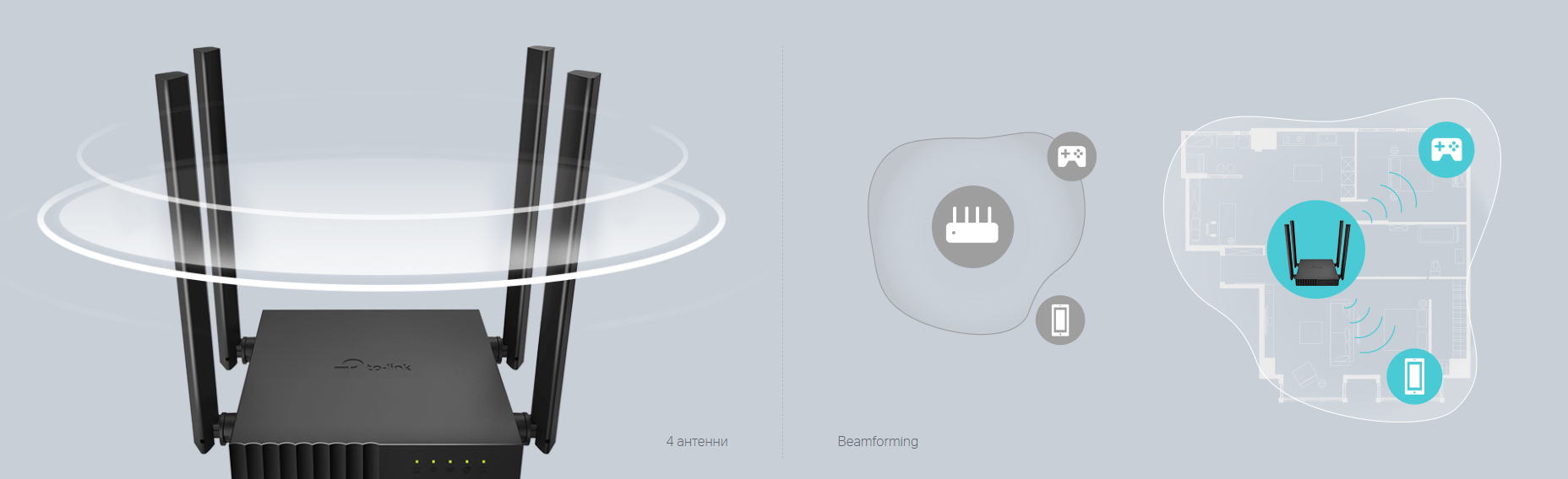- Широке покриття — чотири антени та Beamforming забезпечать гарне Wi-Fi покриття та надійне підключення.