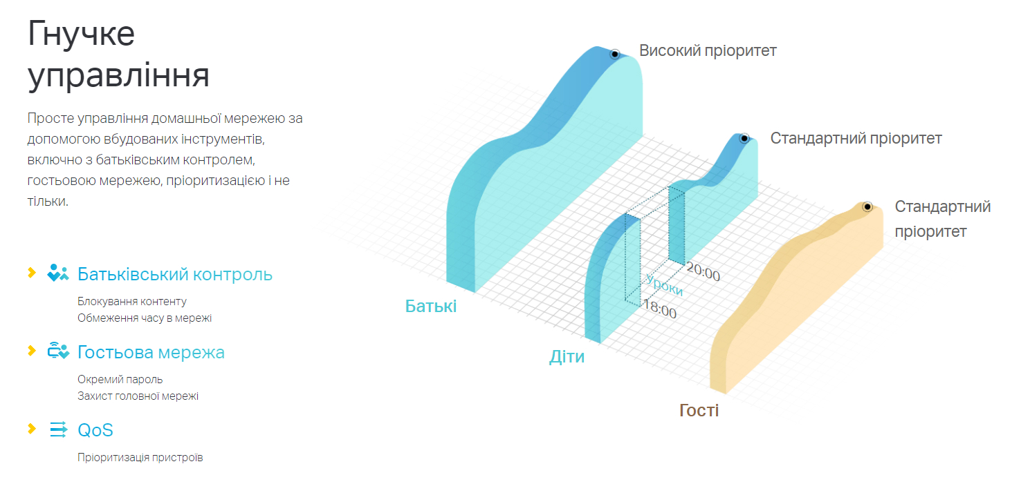 - Батьківський контроль — дозволяє визначати час і спосіб інтернет-доступу підключених пристроїв.