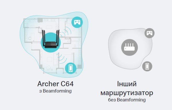 Завдяки чотирьом високопродуктивним зовнішнім антенам маршрутизатора Archer C64 сигнал Wi-Fi буде у всьому будинку, а технологія Beamforming дозволить покращити якість сигналу для віддалених пристроїв шляхом виявлення їх місця розташування і концентрування сигналу в їхньому напрямку.