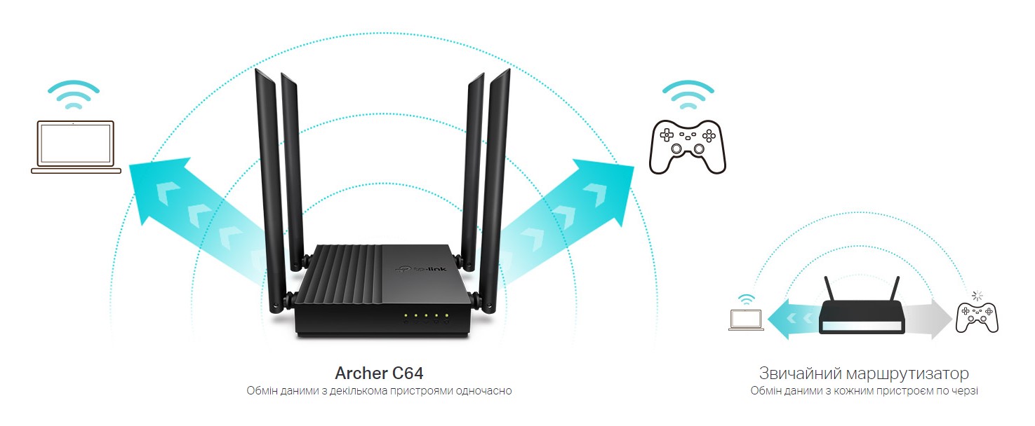 - MU-MIMO — забезпечує у два рази більше одночасних підключень**;