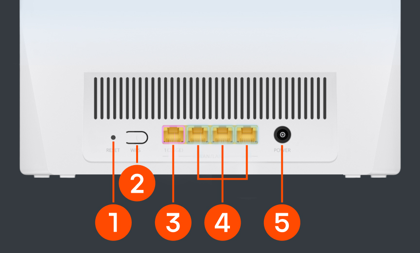 - WAN/LAN 2,5 Гбіт/с — універсальний порт для підключення інтернет-кабелю від провайдера (WAN) або для дротового підключення пристроїв у локальній мережі (LAN) з максимальною швидкістю до 2,5 Гбіт/с.