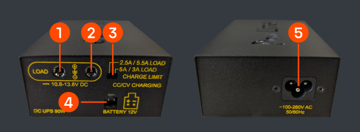 - 2,5A / 5,5A LOAD (Максимальна Потужність): ДБЖ забезпечує максимальний вихідний струм (до 5,5A) для всіх пристроїв, а зарядка акумулятора відбувається повільніше (з обмеженням до 2,5А);