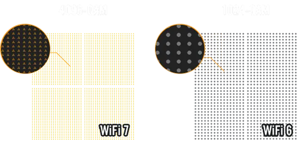 Порівняно з модуляцією 1024-QAM у стандарті Wi-Fi 6/6E, модуляція 4096-QAM дозволяє кожному сигналу об’єднувати більше даних, забезпечуючи до 20% вищу ефективність передавання даних.