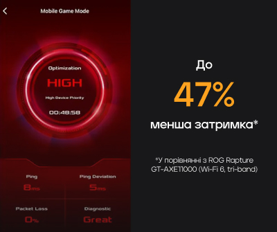 *У порівнянні з ROG Rapture GT-AXE11000 (Wi-Fi 6, tri-band)