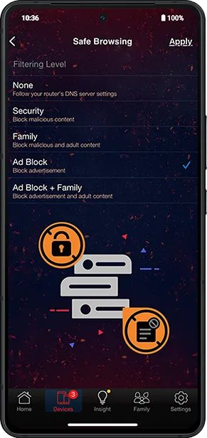 ![]() | Safe Browsing Налаштуйте захист для окремих користувачів або групи пристроїв за допомогою фільтрів безпеки, щоб убезпечити свою активність в Інтернеті. Наприклад, інструмент AdGuard DNS пропонує функції блокування реклами та захисту конфіденційності*. * Використовуючи функцію Safe Browsing, ви погоджуєтеся з тим, що параметри блокування та фільтрування вмісту встановлює сторонній постачальник сервісу DNS. | |